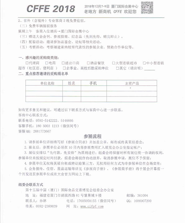 点击此处下载附件1:参展企业针对厦门特食展组织专业观众意见调查表